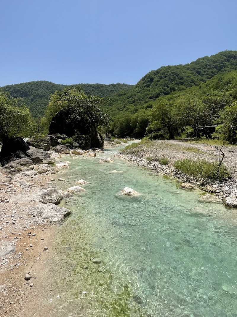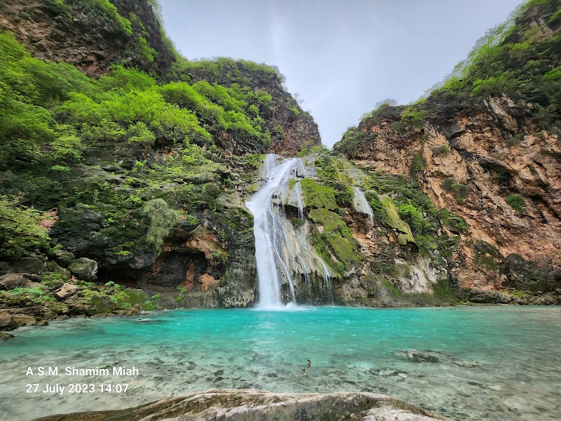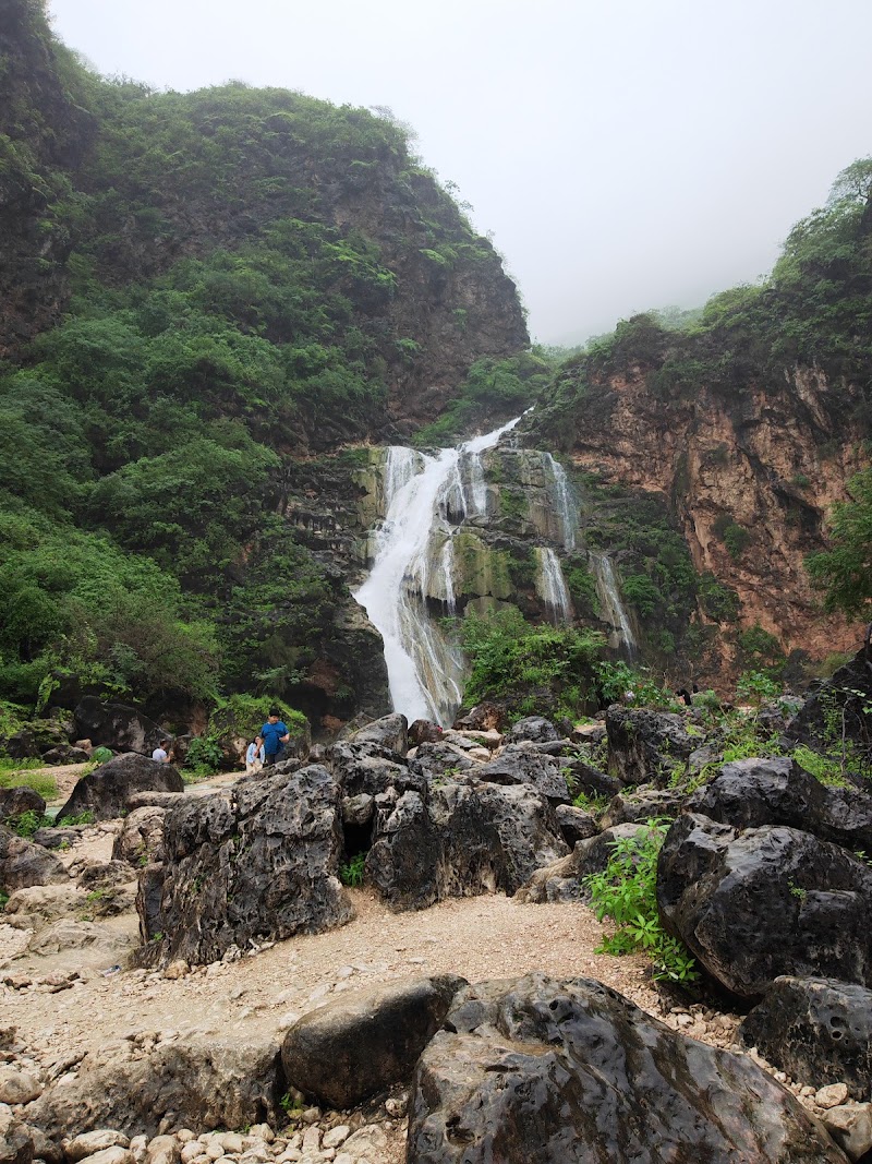 Seasonal waterfall falling down a cliffside into an azure rock pool & appearing after monsoon rains.